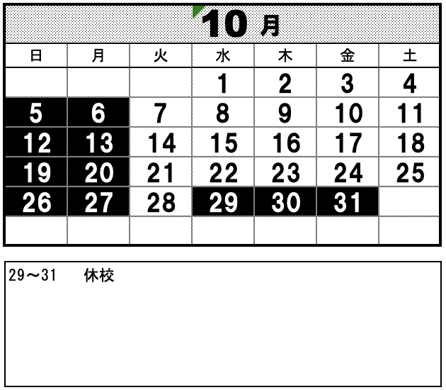 休校日: 月曜・日曜(ページ上部に掲示している教室カレンダーもご覧下さい)