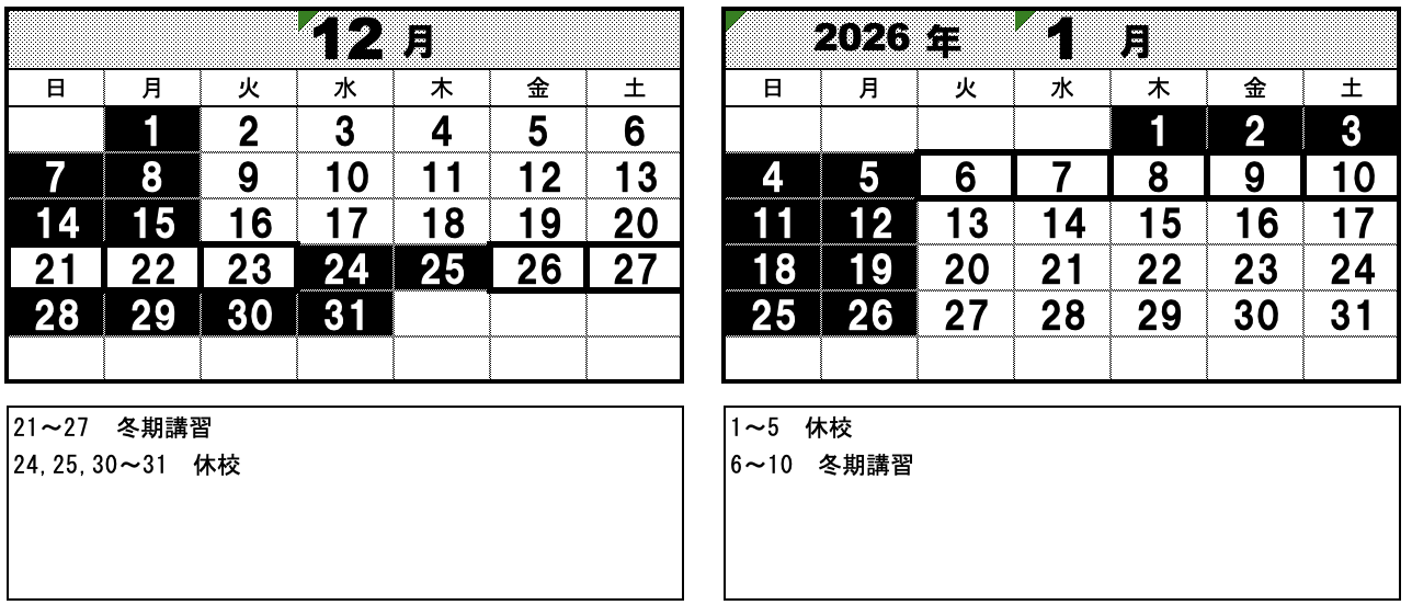 休校日: 月曜・日曜(ページ上部に掲示している教室カレンダーもご覧下さい)