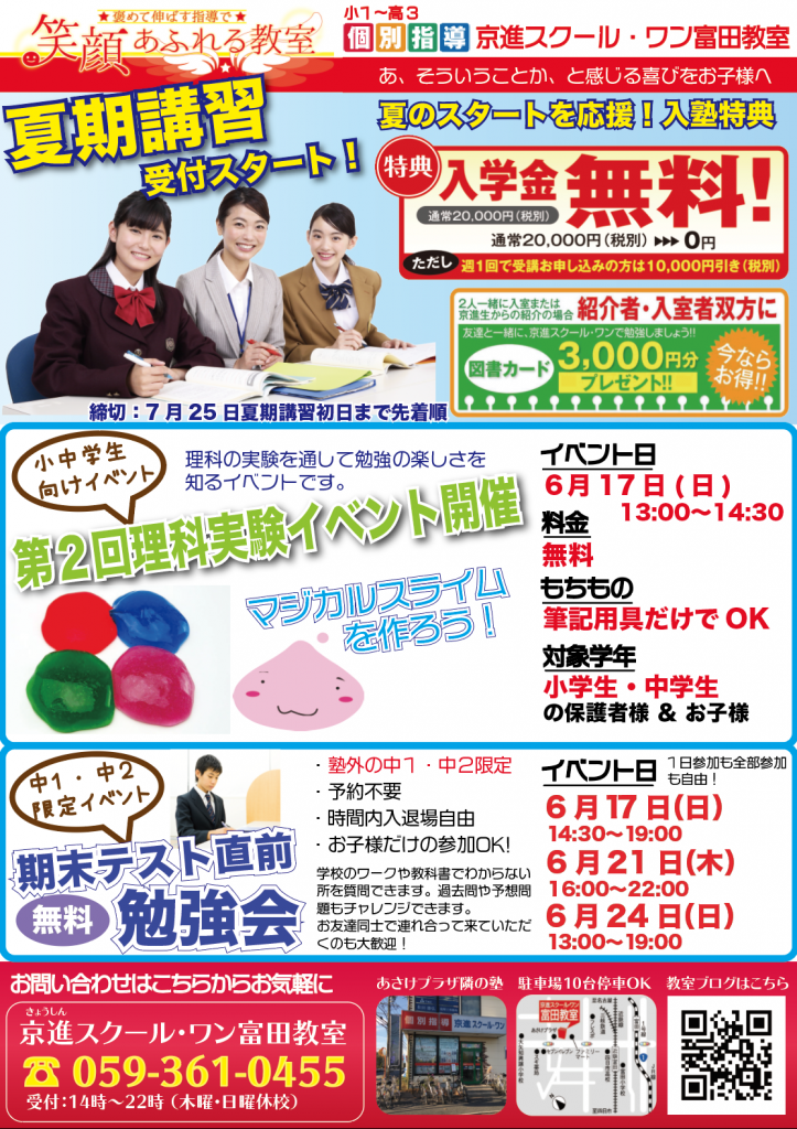 富田教室の吉川です。 6月から、いよいよ夏期講習の受付がスタートします! 夏期講習だけ受けてみたい短期生も大歓迎します。京進生と一緒に頑張りませんか?お気軽にお問…