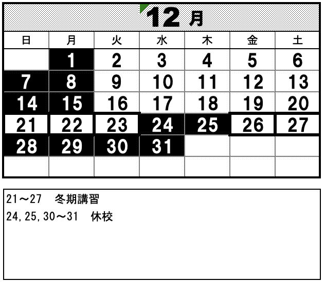 休校日: 月曜・日曜(ページ上部に掲示している教室カレンダーもご覧下さい)